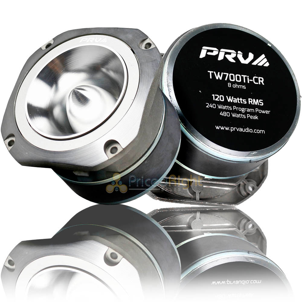 2 Pack of TW700Ti-CR Tweeters from PRV Audio. When you are looking to add a high output, high-frequency response to your system make sure you check out these PRV Audio TW700Ti-CR super tweeters. PRV designed these tweeters for accurate and reliable performance. Each of these TW700Ti super tweeters has a power handling of 120 Watts RMS and an impedance of 8 Ohms. PRV manufactured this tweeter using a 1.5" diameter copper voice coil to handle a higher amount of power, and a titanium ring-radiator diaphragm for a more accurate and detailed response. The front mount design was designed for easy installation and flat sides for a side by side multiple driver systems.